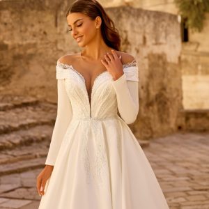 Ένα νυφικό που συνδυάζει απαλή θηλυκότητα με διακριτική πολυτέλεια. Η φίνα δαντέλα χαρίζει στο μπούστο μια ρομαντική υφή, ενώ η αέρινη φούστα προσφέρει άνεση και ελαφριά κίνηση σε κάθε βήμα.