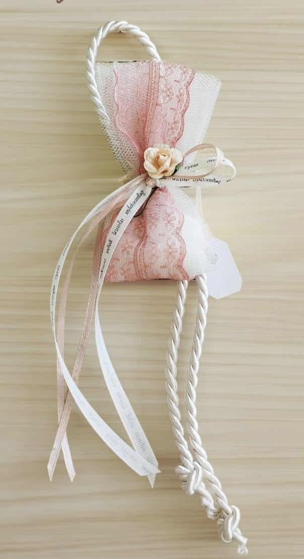 Μπομπονιέρα γάμου κρεμαστή πουγκάκι με λουλουδάκι SA23-37