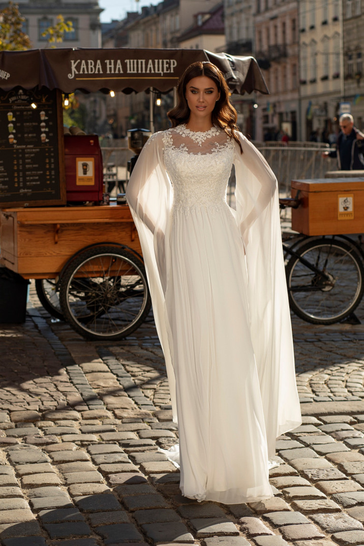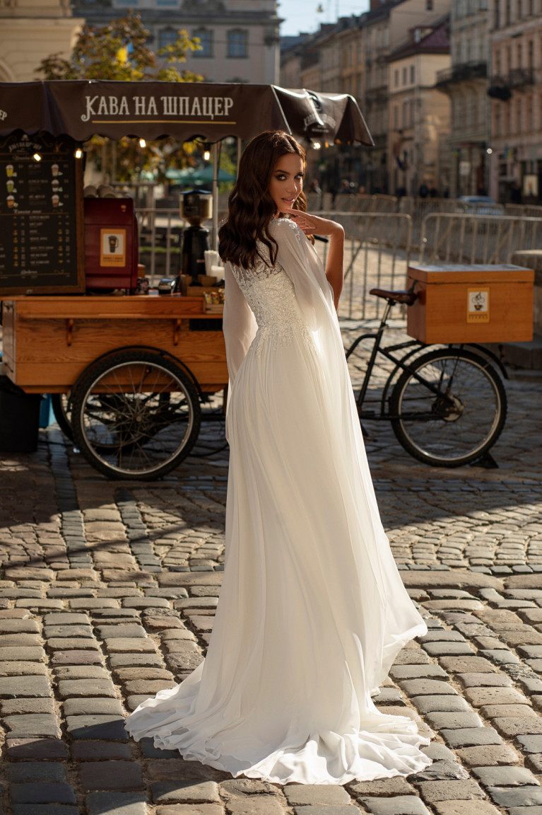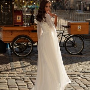 Ιδανικό για νύφες που επιθυμούν μια κομψή, ανάλαφρη εμφάνιση. Αυτό το νυφικό ισορροπεί την απλότητα και την κομψότητα. Κατασκευασμένο από απαλό σιφόν, προσφέρει μια ρέουσα εμφάνιση. Το κλειστό σχέδιο στην πλάτη προσθέτει σεμνότητα, διατηρώντας παράλληλα ένα μοντέρνο στυλ.