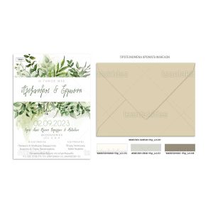 Προσκλητήριο γάμου με greenery και στοιχεία από κλαδιά και ευκάλυπτο.