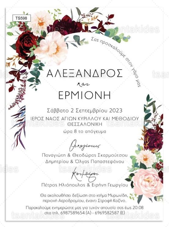 Προσκλητήριο γάμου με floral σχεδιασμό σε burgundy και ροζ pastel χρωματισμούς.