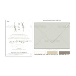 Προσκλητήριο γάμου σε λαδί αποχρώσεις και λογότυπο η ημερομηνία με κλαδιά ελιάς.