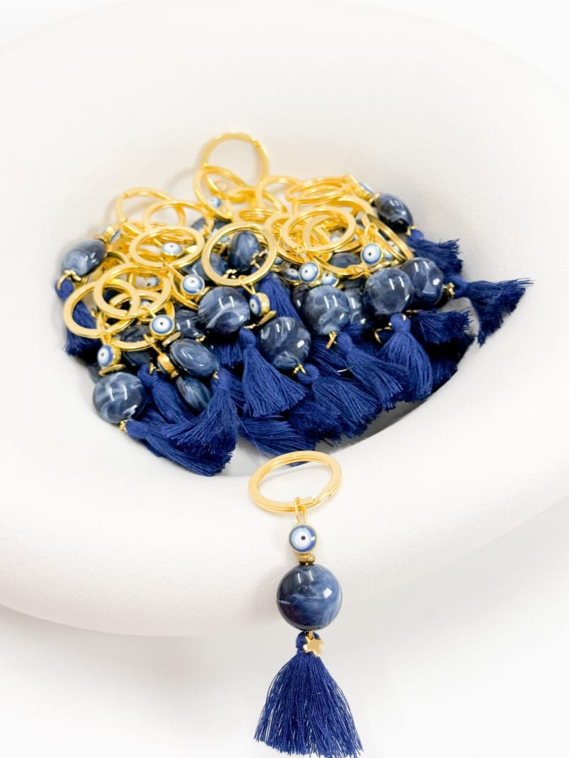 Μαρτυρικό μπρελοκ με stainless steel σταυρό,φούντα και χάντρα με νερά.