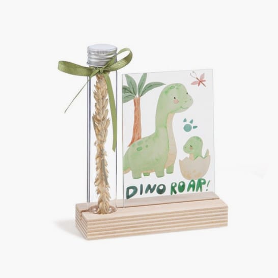 Ξύλινη βάση με print παραλληλόγραμμο καδράκι plexiglass σε λευκό χρώμα και γυάλινο δοκιμαστικό σωλήνα.Η παράσταση απεικονίζει τον Dino το δεινοσαυράκι.