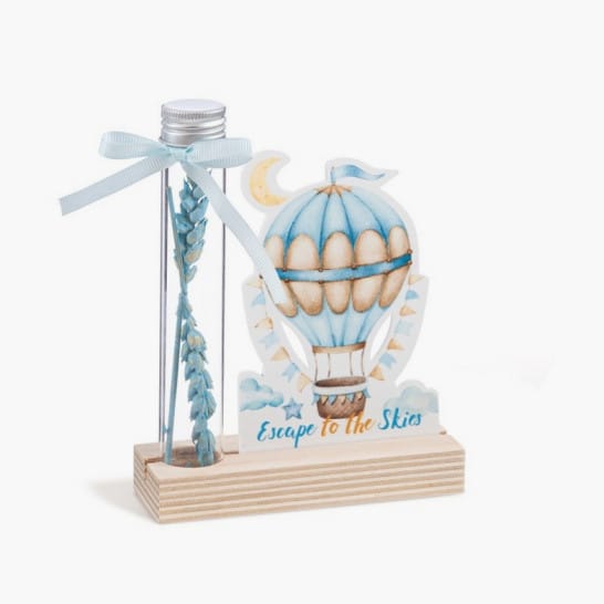 Ξύλινη βάση με print καδράκι plexiglass σε λευκό χρώμα και γυάλινο δοκιμαστικό σωλήνα.Η παράσταση απεικονίζει το αερόστατο σε σιέλ αποχρώσεις δίνοντας το σύνθημα ” Escape to the skies”.