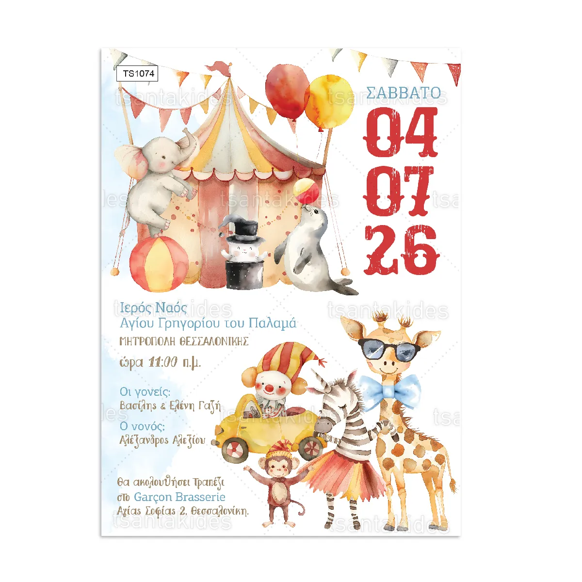 Προσκλητήριο βάπτισης για αγόρι εκτυπωμένο με θέμα Circus TS1074