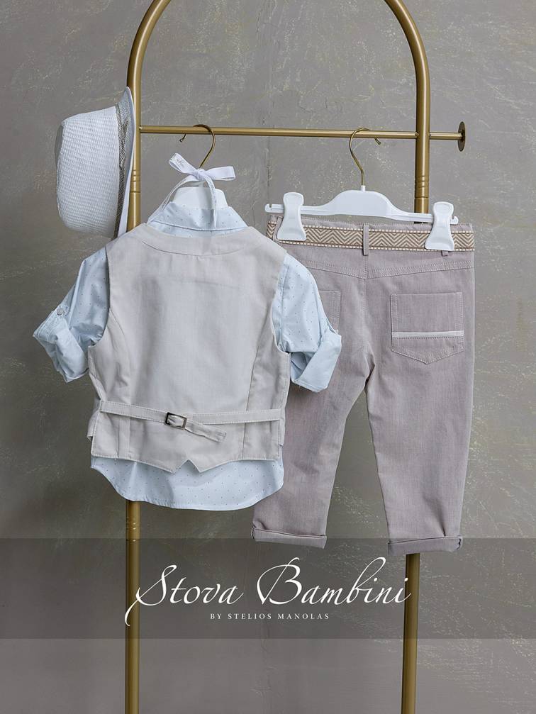 Stova Bambini βαπτιστικό σύνολο 5 τεμ. από υψηλής ποιότητας βαμβάκι, ιδανικό για τις ζεστές καλοκαιρινές εμφανίσεις με κομψότητα και άνεση. Το γιλέκο, σε κλασική γραμμή και light beige απόχρωση, ξεχωρίζει για την καθαρή, διαχρονική αισθητική του και διαθέτει 3 κουμπιά που ενισχύουν τον refined χαρακτήρα του. Το πουκάμισο είναι Ισπανικό, από εξαιρετικής ποιότητας βαμβάκι, με διακριτικό printed μοτίβο σε απόχρωση που δένει με το γιλέκο, δημιουργώντας ένα απόλυτα ισορροπημένο και καλαίσθητο αποτέλεσμα. Το beige βαμβακερό παντελόνι, σε καθαρή γραμμή, συνοδεύεται από ζώνη που ολοκληρώνει το outfit με κομψότητα και πρακτικότητα, ενώ το καπέλο έρχεται να προσθέσει την τελική πινελιά στυλ, χαρίζοντας μια ολοκληρωμένη, sophisticated εμφάνιση.