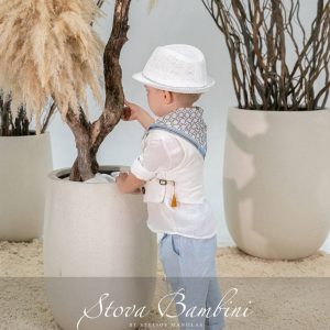 Stova Bambini Βαπτιστικό σύνολο 5 τεμ. από 100% Top Quality υλικά. Το νέο ασύμμετρο, κρουαζέ total white γιλέκο από 100% ισπανικό βαμβάκι ξεχωρίζει για τον ιδιαίτερο χαρακτήρα του, ενώ ολοκληρώνεται με κρεμαστά δερμάτινα αξεσουάρ από ιταλικό Nappa δέρμα, διακοσμημένα με το λογότυπο Stova Bambini — μια αυθεντική signature λεπτομέρεια. Το πουκάμισο με Mao γιακά είναι από βαμβακερή γάζα Ισπανίας και προσδίδει minimal κομψότητα, ενώ το νέο σχέδιο παντελονιού Stova σε απαλή σιέλ απόχρωση, από 100% Top Quality Linen Ισπανίας, προσφέρει άψογη εφαρμογή χάρη στη ζώνη/κορδόνι που ενσωματώνεται εσωτερικά. Το σύνολο ολοκληρώνεται με Ιταλικό printed φουλάρι και ασορτί καπέλο, δημιουργώντας ένα ολοκληρωμένο, refined look.