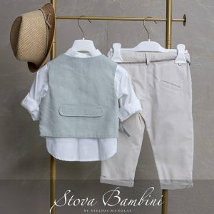 Stova Bambini Βαπτιστικό σύνολο 6 τεμ. από 100% Top Quality Cotton Ισπανίας. Το κλασικό wrap-style γιλέκο Stova από 100% Cotton σε soft απόχρωση μέντας αναδεικνύει τον διαχρονικό χαρακτήρα του brand. Άψογα συνδυασμένο με βαμβακερό πουκάμισο με Mao γιακά σε λευκή απόχρωση , ενώ το νέο σχέδιο παντελονιού Stova σε light beige απόχρωση, προσφέρει άψογη εφαρμογή και δένει αρμονικά με την μοναδική πλεκτή ζώνη απο φυσικό σχοινί με signature κόμπο. Το σύνολο ολοκληρώνεται με ιταλικό pochette με ιδιαίτερο print και ασορτί καπέλο, δημιουργώντας ένα ολοκληρωμένο, Stova look.