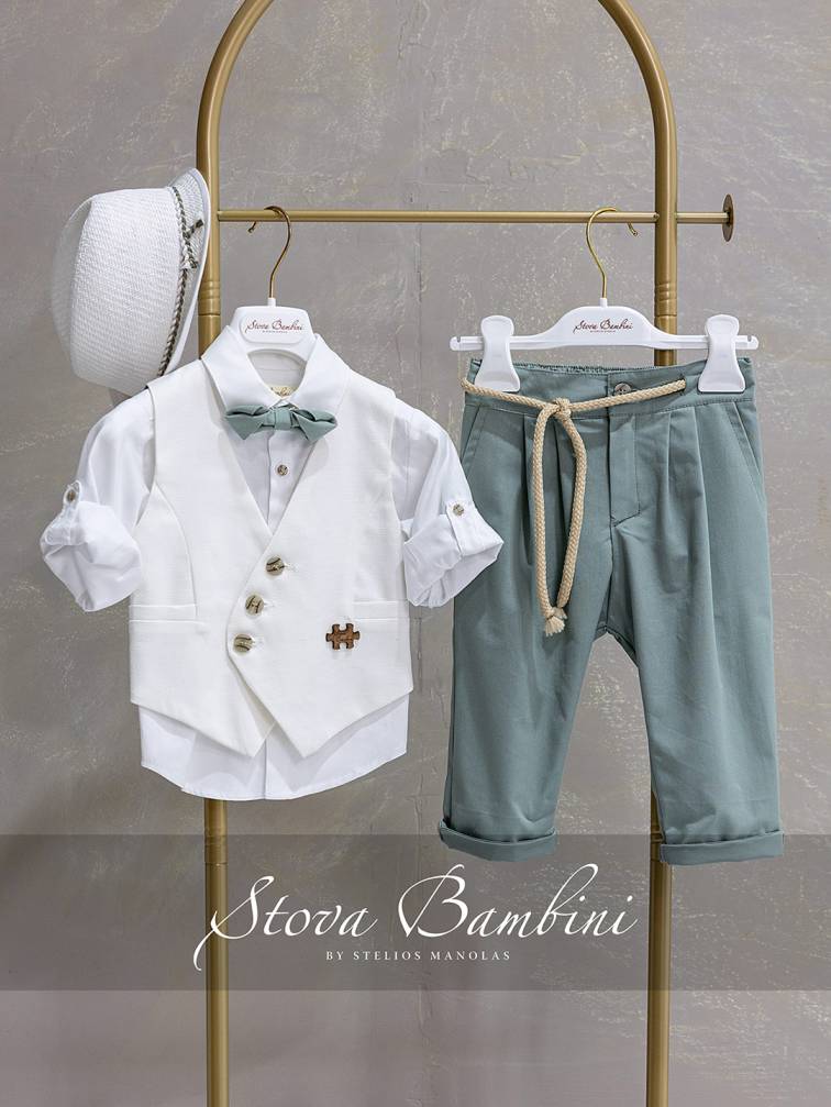 Stova Bambini βαπτιστικό σύνολο 5 τεμ. σχεδιασμένο με κομψότητα και διαχρονική αισθητική, από 100% top quality υλικά. Το κρουαζέ γιλέκο σε white απόχρωση από υψηλής ποιότητας βαμβακερό ύφασμα Ισπανίας με φυσική ανάγλυφη υφή αποπνέει έναν διαχρονικό χαρακτήρα, ενώ διακοσμείται με ιδιαίτερα κουμπιά τύπου ταρταρούγα δημιουργώντας ένα υπέροχο κλασσικό βαπτιστικό σύνολο. Το λευκό πουκάμισο από 100% βαμβάκι Ισπανίας, προσθέτει φρεσκάδα και καλοκαιρινή κομψότητα, ολοκληρώνοντας ιδανικά την εικόνα. Η βαμβακερή καπαρντίνα Ισπανίας σε απόχρωση μέντας που έχει επιλεχθεί για το παντελόνι σε χαλαρή, άνετη γραμμή προσφέρει άνεση και στυλ, ιδανικό για τις ζεστές ημέρες του καλοκαιριού. Το σύνολο ολοκληρώνεται με ένα υπέροχο παπιγιόν από το ύφασμα του παντελονιού.