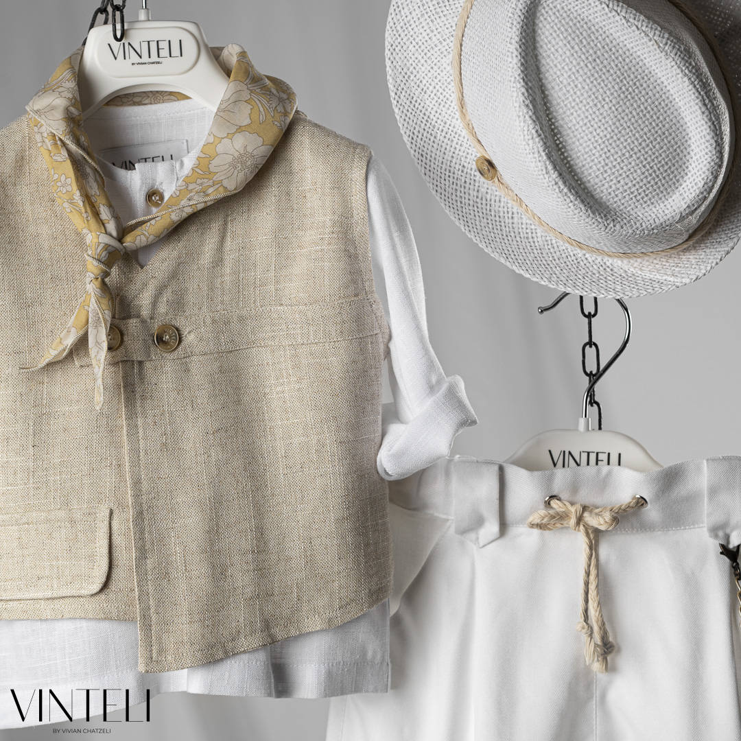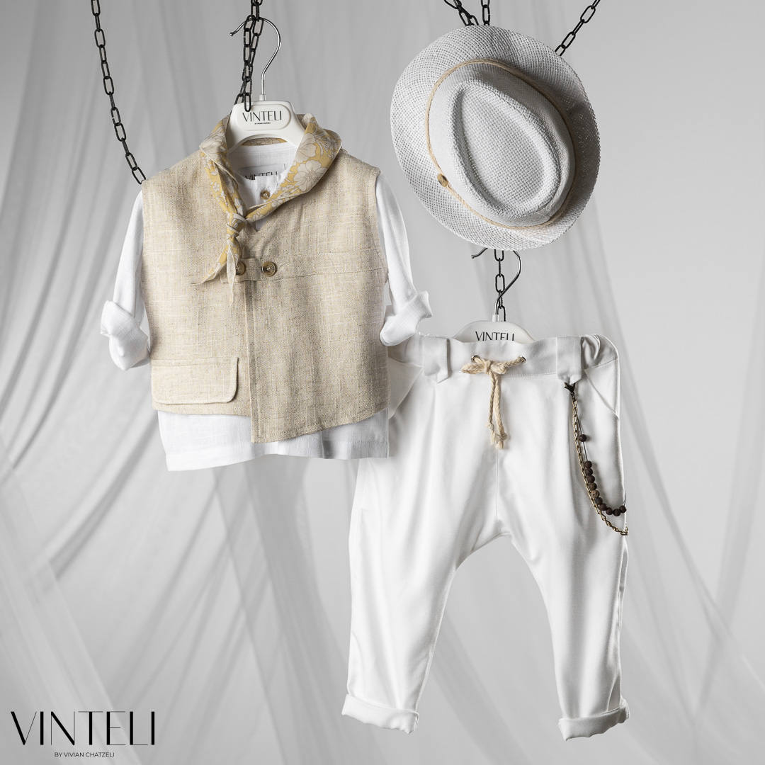 Ένα σύγχρονο και ιδιαίτερο βαπτιστικό σύνολο που συνδυάζει άνεση και στυλ. Περιλαμβάνει πουκάμισο, γιλέκο με minimal γραμμή και κουμπιά, παντελόνι με χαλαρή εφαρμογή και ρεβέρ, καθώς και καπέλο. Το φουλάρι δίνει μια πιο ανάλαφρη, καλοκαιρινή διάθεση, ιδανική για ξεχωριστές στιγμές.