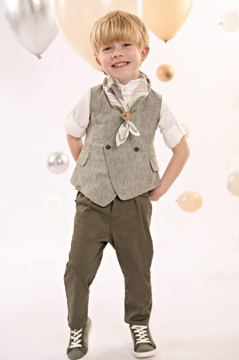 Ένα ιδιαίτερο σύνολο που αποπνέει κομψότητα και φρεσκάδα. Το δίπιετο παντελόνι με την έξτρα λοξή ζώνη σε λαδί βαμβακερή καμπαρντίνα δημιουργεί μια μοντερνα, αλλά κομψή γραμμή. Το μοναδικό αυτό γιλέκο, σταυρωτό, με τσέπες πατάκια και ασύμμετρο τελείωμα, σε χακί ψιλή-ρίγα από cotton-lino, προσφέρει μια μοντέρνα και φρέσκια προσέγγιση στην κλασική κομψότητα. Το βαμβακερό πουκάμισο σε off white απόχρωση με το ιδιαίτερο Mao γιακά φέρνει μια διακριτική και κομψή αίσθηση. Το personalized βουάλ φουλάρι με τα γεωμετρικά σχέδια σε μπεζ-λαδί αποχρώσεις προσθέτει χαρακτήρα, ενώ το ψάθινο καπέλο ή η τραγιάσκα (κατά επιλογή) αναδεικνύει άψογα το look.