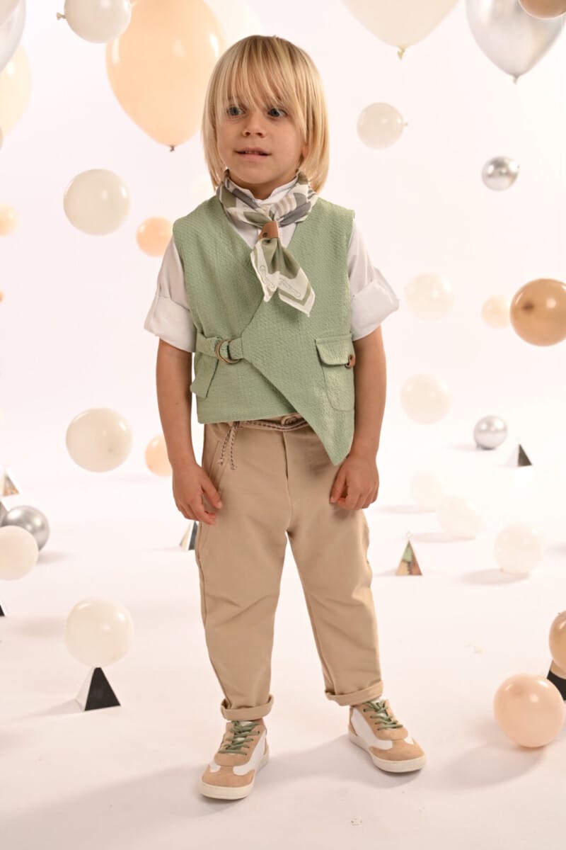 Ένα σύγχρονο και κομψό σύνολο, που συνδυάζει υφές και γραμμές με ξεχωριστό τρόπο. Το παντελόνι, σε μπεζ βαμβακερό jersey ύφασμα, διαθέτει ιδιαίτερα κοψίματα στο πλάι και εξωτερικές πίσω τσέπες, προσθέτοντας μια casual νότα στο ρούχο. Το γιλέκο, από βαμβακερό γκοφρέ ύφασμα σε χρώμα green aloe, με ασύμμετρο κόψιμο και εξωτερικό τσεπάκι, δένει άψογα με το βαμβακερό πουκάμισο σε off white απόχρωση και τον χαρακτηριστικό Mao γιακά του. Το σύνολο ολοκληρώνεται με το personalized βουάλ φουλάρι σε γεωμετρικά μπεζ-λαδί μοτίβα, τη μελανζέ ζώνη από κορδόνι και το ψάθινο καπέλο ή τραγιάσκα (ανάλογα με την προτίμηση)