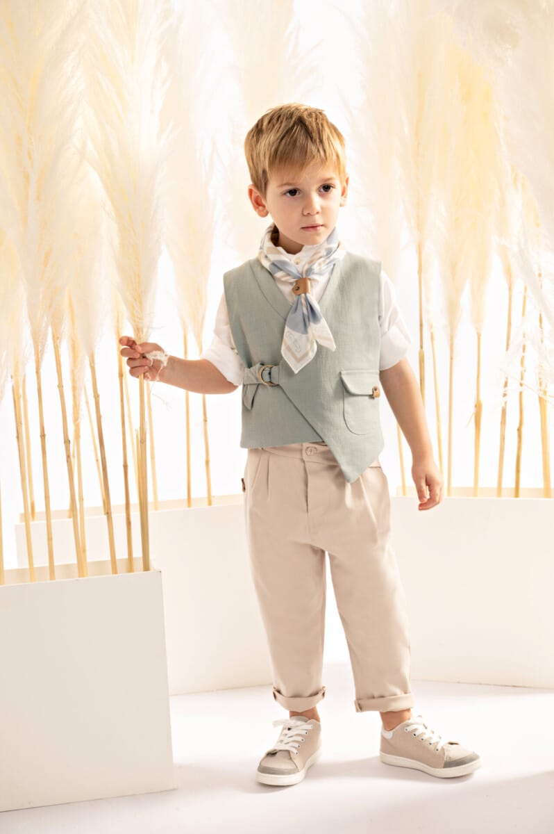 Ένα φωτεινό και μοντέρνο σύνολο αποτελούμενο από παντελόνι δίπιετο με έξτρα λοξή ζώνη από μπεζ βαμβακερή καμπαρντίνα και γιλέκο με ασύμμετρο κόψιμο, εξωτερικό τσεπάκι και λινό ύφασμα σε mint χρώμα. Το βαμβακερό πουκάμισο σε off white απόχρωση διαθέτει έναν πολύ ιδιαίτερο Μao γιακά, ενώ το σύνολο ολοκληρώνεται με το personalized βουάλ φουλάρι με γεωμετρικά σχέδια σε μπεζ-σιέλ αποχρώσεις και το ψάθινο καπέλο (ή τραγιάσκα κατά επιλογή), προσφέροντας μια διακριτική και κομψή αίσθηση.