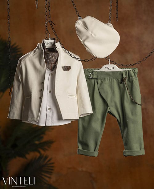 Κομψό και elegant μάο κοστούμι σε ιβουάρ απόχρωση στολίζεται από εμπριμέ μποτουνιέρα ίδια με το φουλαράκι. Το παντελόνι με χαμηλό καβάλο διαθέτει πλαινό κούμπωμα με κρικάκια. Στο κλασσικό πουκάμισο αντίθεση δίνουν τα ανοιχτά πράσινα κουμπιά συνδιασμένα με τα εξωτερικά του σακκακιού. Συνοδεύεται από εμπριμέ μαντήλι για το λαιμό και ιβουάρ τραγιάσκα. Σετ 5 τεμαχίων.