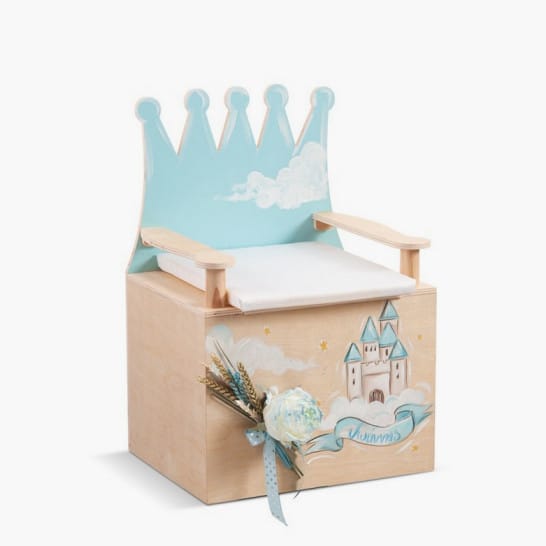 Once upon a time. Ξύλινο κουτί βαπτιστικών καθισματάκι σε σχήμα θρόνου με μαξιλάρι.Το μπροστινό κομμάτι είναι ζωγραφισμένο σε σιέλ αποχρώσεις με το κάστρο ενός πρίγκιππα και διακοσμημένο με μπουκέτο λουλουδιών ενώ η πλάτη έχει το σχήμα κορώνας.