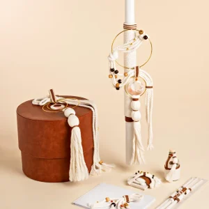 Πακέτο για ιδιαίτερα γούστα, βαρελάκι δερματίνη στο χρώμα του σαφράν και για στολισμό μια σύνθεση κόσμημα από λευκά κορδόνια, χρυσά στεφανάκια, χάντρες και λεπτομέρειες από φίλτεση. Η λαμπάδα ξεχωρίζει για το εντυπωσιακό της design, σχεδιασμένη άψογα με το βιβλίο ευχών και το σέτ λαδιού.