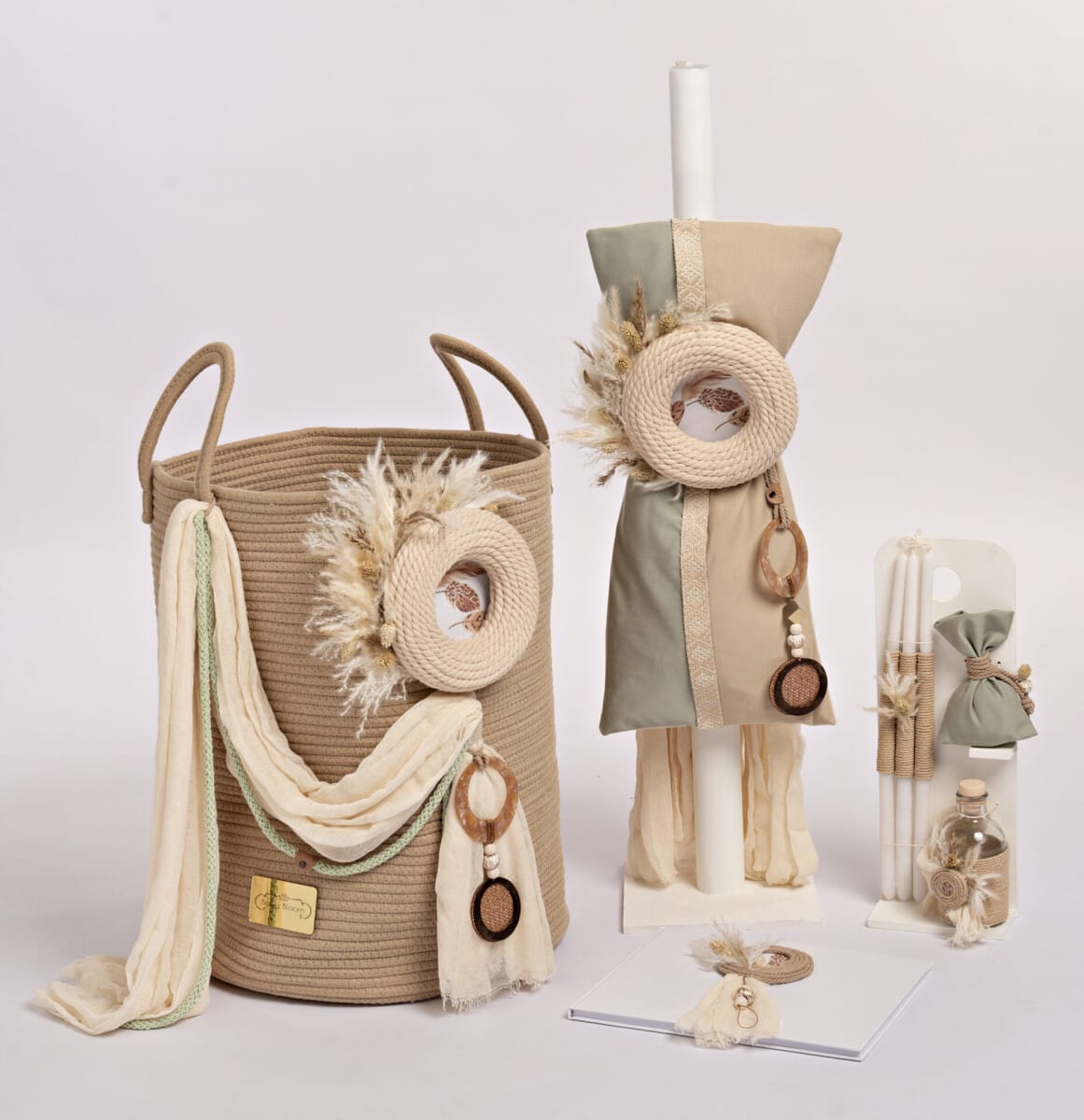 Ένα πακέτο στολισμένο με πολλά ιδιαίτερα στοιχεία! Υφάσματα κορδόνια χάντρες, φυσικά λουλούδια ντεκουπάζ και fildisi σε αποχρώσεις του μπεζ του βεραμάν και του καφέ συνδυάζονται φτιάχνοντας ένα ζεστό ολοκληρωμένο πακέτο που αποτελείται από υφασμάτινο μπεζ καλάθι, λαμπάδα, σετ λαδιού και ευχολόγιο για ολοκληρώσουν μια βάφτιση με boho διάθεση και όχι μόνο!