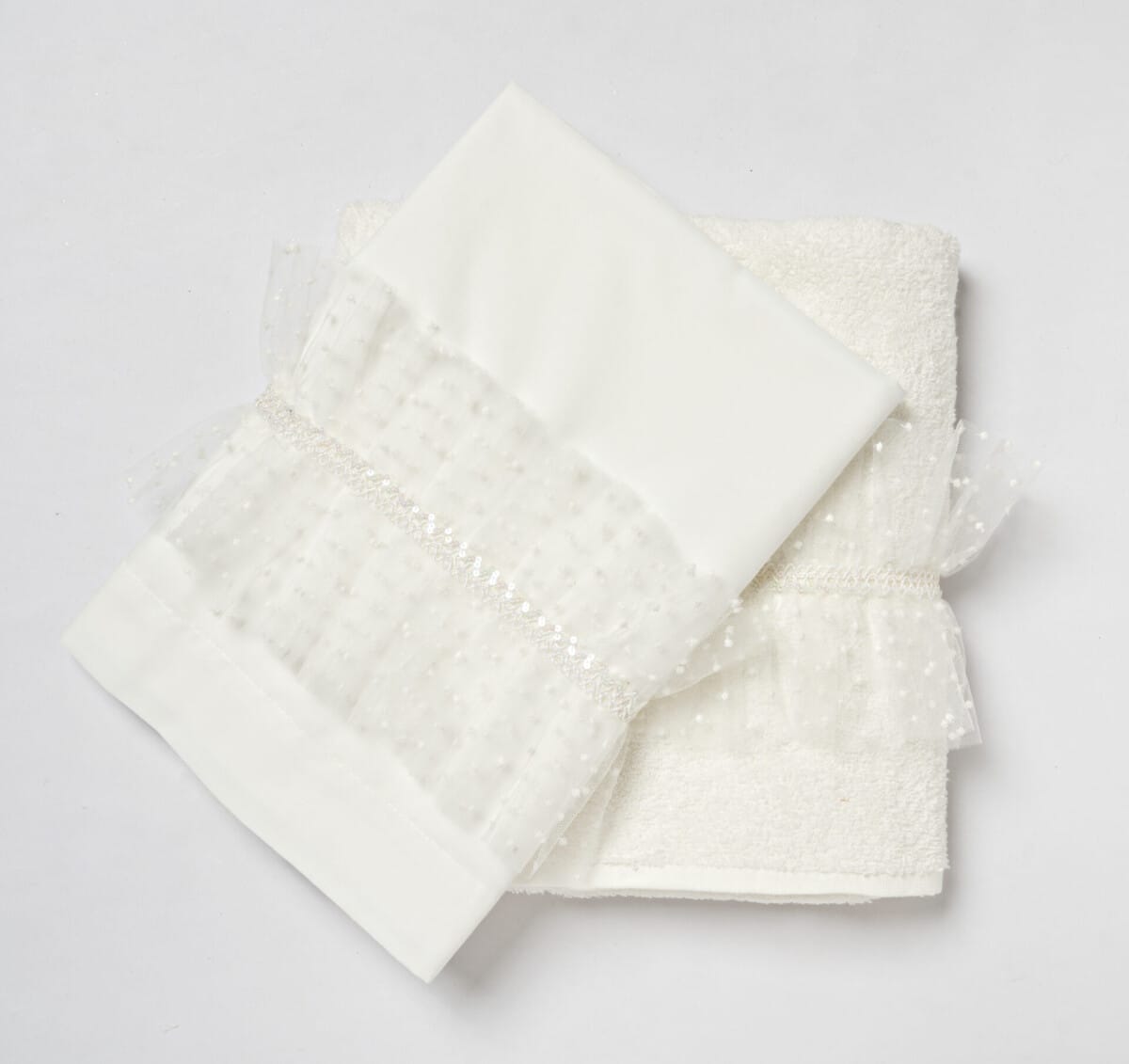 Εντυπωσιακά βαμβακερά λαδόπανα σε ιβουάρ χρώμα με πλούσιο βολάν από κεντητό τούλι πουά, και διαίτερη μπέζ δανδέλα με παγιέτες . Τα λαδόπανα περιλαμβάνουν μεγάλη πετσέτα και σεντόνι , πετσέτα μικρη και εσώρουχα .