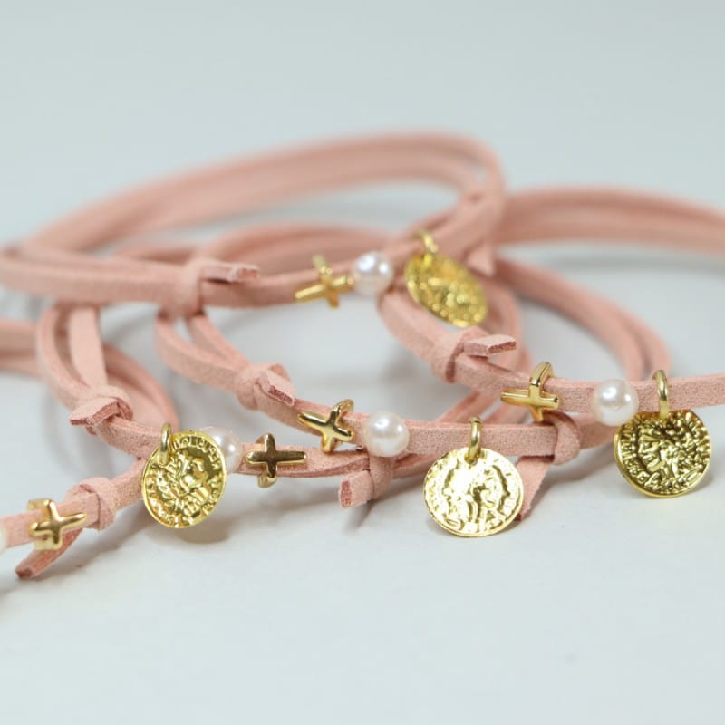 Χειροποίητο μαρτυρικό βραχιολάκi με σουέτ κορδόνι σάπιο μήλο,φλουρί και επιχρυσωμένο σταυρό.