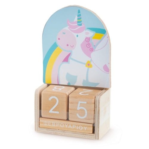 Ξύλινο natural ημερολόγιο με δυνατότητα αλλαγής της ημερομηνίας προσαρμόζοντας τα κυβάκια. Είναι διακοσμημένο με ξύλινη παράσταση print μονόκερος σε σιέλ-ροζ αποχρώσεις.