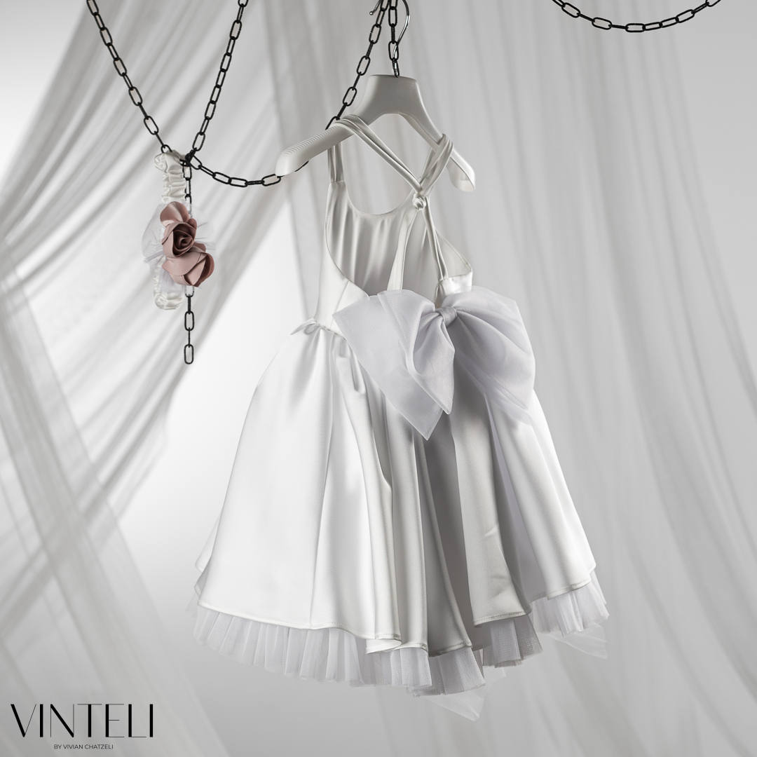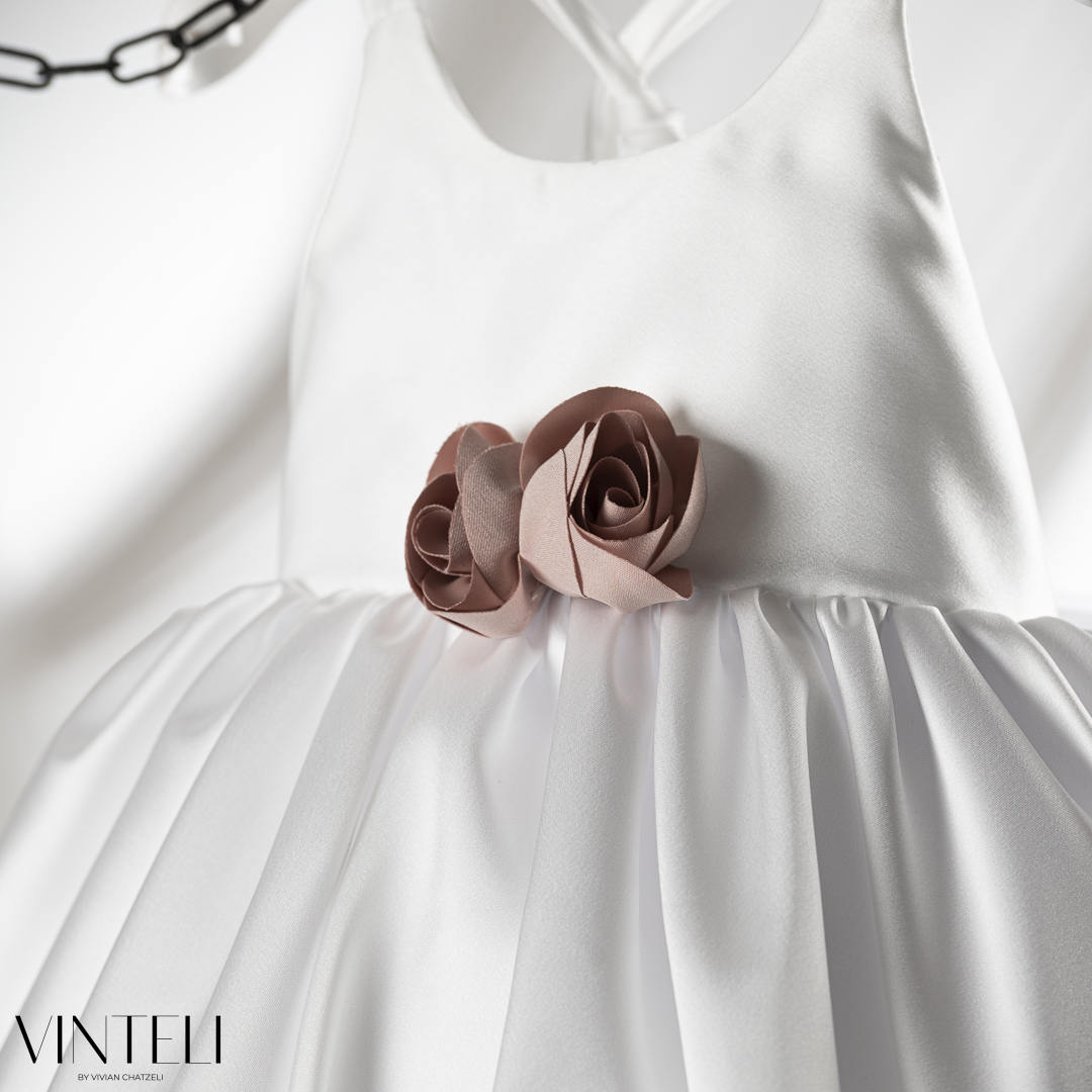 Βαπτιστικό φόρεμα σε λευκή απόχρωση από απαλό σατέν, με πλούσια φούστα που ανοίγει όμορφα και χαρίζει κίνηση. Το λιτό μπούστο αναδεικνύεται από τα διακριτικά χειροποίητα λουλούδια στη μέση, προσθέτοντας μια γλυκιά, ιδιαίτερη πινελιά. Το σύνολο συνοδεύεται από ασορτί κορδέλα μαλλιών που ολοκληρώνει ιδανικά την εμφανιση. Μια σύγχρονη επιλογή για τη βάπτιση, που ξεχωρίζει με την απλότητά της.