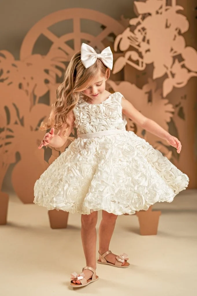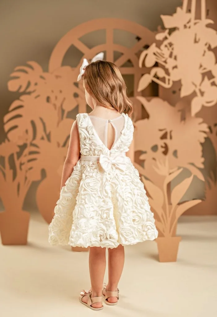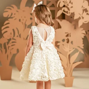 Ένα μοναδικό φόρεμα, φτιαγμένο εξολοκλήρου από εκπληκτικό ύφασμα με απλικέ τριαντάφυλλα σε ιβουάρ απόχρωση, ντουμπλαρισμένο με τούλι στο χρώμα της πούδρας και γκλίτερ για διακριτική λάμψη. Το μπούστο απλό μπροστά, διαθέτει υπέροχη ανοιχτή πλάτη πίσω, ενώ η πλούσια φούστα ομπρέλα με τη σατέν ζώνη στο χρώμα της πούδρας, στολίζεται υπέροχα με ένα σατέν εντυπωσιακό φιόγκο στο πίσω μέρος. Το σύνολο ολοκληρώνεται με την τούλινη κορδέλα για τα μαλλιά διακοσμημένη με ένα μεγάλο σατέν φιόγκο ασορτί με το φόρεμα.
