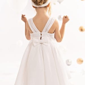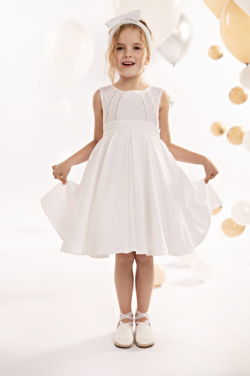Ένα φόρεμα εμπνευσμένο από την δεκαετία του ’50 σε off white χρώμα, φτιαγμένο από ύφασμα υψηλής ποιότητας λινό-βαμβάκι που συνδυάζει την κλασική σικάτη αίσθηση με το σύγχρονο design και αποπνέει μία αίσθηση κομψότητας και πολυτελούς απλότητας. Η λαιμόκοψη bateau, συνδυασμένη με διακοσμητικές διάτρητες τρέσες στο μπούστο, προσδίδει ένα μοντέρνο αλλά διακριτικό στοιχείο, ενώ οι φαρδιές τιράντες πίσω, που καταλήγουν σε V, ενισχύουν την κομψή γραμμή του σχεδίου. Η πλούσια φούστα ομπρέλα με πιέτες, χαρίζει όγκο και κίνηση, ενώ η φαρδιά ζώνη που καταλήγει σε φιόγκο πίσω, προσθέτει μία ρομαντική πινελιά. Η κορδέλα για τα μαλλιά με τον εντυπωσιακό φιόγκο προσθέτει την τελευταία ρετρό λεπτομέρεια.
