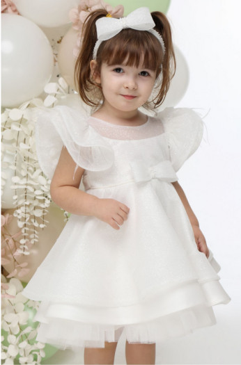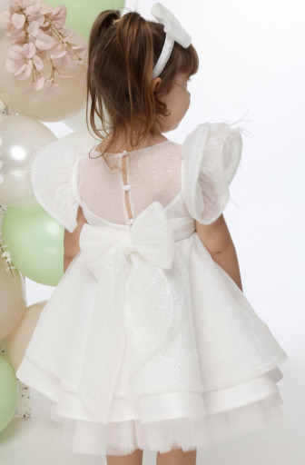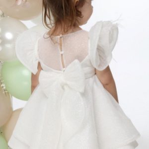 Το πιο εντυπωσιακό φόρεμα της σεζόν για μια βάπτιση ονειρεμένη! Το μπούστο του φορέματος είναι όλο γκλίτερ με εντυπωσιακά μανίκια-βολάν. Η φούστα πλούσια σε όγκο είναι από γκλιτερ με κρένα στο τελείωμα για έξτρα όγκο κ κίνηση. Στο εσωτερικό της φούστας έχει τούλι φουρό, η φόδρα του φορέματος είναι βαμβακερή και το φόρεμα κουμπώνει με φερμουάρ και κουμπί. Το σύνολο ολοκληρώνεται με μια εντυπωσιακή στέκα για τα μαλλιά.
