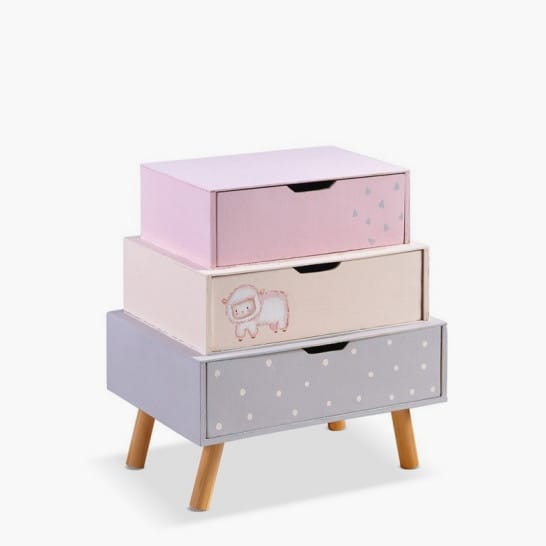 Baby’s Farm. Ξύλινο κουτί βαπτιστικών συρταριέρα. Το κουτί είναι βαμμένο σε ροζ και λιλά αποχρώσεις. Στα συρτάρια είναι ζωγραφισμένο ένα προβατάκι. Ιδανικό και για τη διακόσμηση του παιδικού δωματίου.