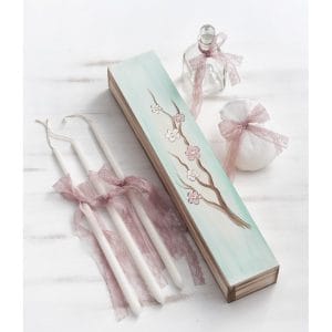 Ξύλινο κουτί συσκευασίας παραλληλόγραμμο ζωγραφισμένο στο χέρι με ανθισμένο κλαδί δέντρου, σε φόντο βεραμάν. Ο κωδικός περιλαμβάνει τα 3 κεράκια, το σαπούνι μέσα σε πουγκάκι και το μπουκάλι του λαδιού, όλα στολισμένα με δαντελίτσα σε σάπιο μήλο χρώμα